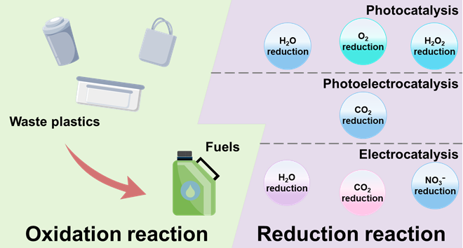 本文主要关注塑料废物的电催化、光催化和光电催化等条件下“绿色”策略的最新发展。在这些“绿色”策略中,塑料在氧化过程中通常会发生相应的还原反应,从而影响催化塑料转化的性能,选择合适的半反应不仅能促进塑料的转化率,还能提高体系的经济效益。本文强调了不同催化过程中相应的半反应,例如光催化在碱性溶液、纯水和过氧化氢溶液中的半反应,电催化中塑料氧化与水还原、CO2还原和硝酸盐还原的耦合,以及光电催化中CO2还原的耦合。最后,本文对如何扩大半反应、强化这些“绿色”策略进行了简要的总结和展望,并探讨了其内在机制和实际应用。