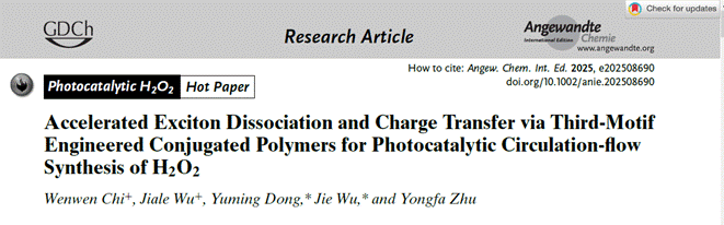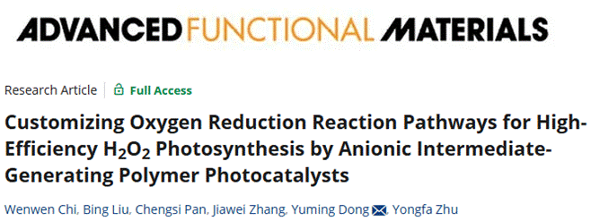 董玉明/朱永法团队在光催化制备双氧水方面取得重要进展,研究成果“Accelerated Exciton Dissociation and Charge Transfer via Third-Motif Engineered Conjugated Polymers for Photocatalytic Circulation-flow Synthesis of H2O2”在线发表于Angew. Chem. Int. Ed.,研究成果“Customizing Oxygen Reduction Reaction Pathways for High-Efficiency H2O2Photosynthesis by Anionic Intermediate-Generating Polymer Photocatalysts”在线发表于Adv. Funct. Mater.。