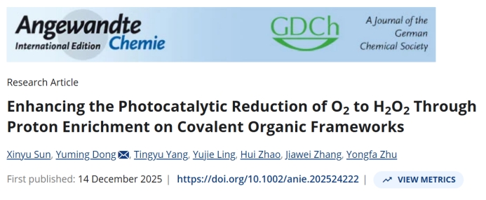 董玉明教授在光合成双氧水领域取得突破性进展,研究成果以“Enhancing the Photocatalytic Reduction of O2to H2O2Through Proton Enrichment on Covalent Organic Frameworks”为题发表在《Angewandte Chemie International Edition》上(DOI:10.1002/anie.202524222)。论文第一作者为博土研究生孙新宇,通讯作者为董玉明教授。
