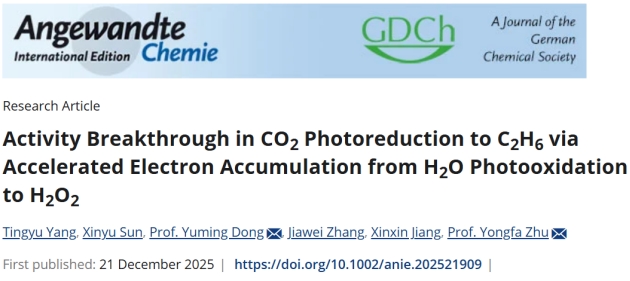 董玉明教授团队在光合成领域取得突破性进展,C2H6/H2O2联产的研究成果以“Activity Breakthrough in CO2Photoreduction to C2H6via Accelerated Electron Accumulation from H2O Photooxidation to H2O2”为题发表在《Angewandte Chemie International Edition》上(DOI:10.1002/anie.202521909)。论文第一作者为博土研究生杨婷羽,通讯作者为董玉明教授和朱永法教授。