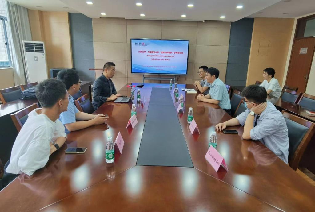 报告会后,Wuge教授参加了“胶体与软物质”学术研讨会,与合成与生物胶体教育部重点实验室的骨干教师一同研讨交流。研讨会上,潘庆伟书记首先致辞,对教授的来访表示热烈欢迎。随后,化工系主任蒋建中教授介绍了重点实验室的组织架构、人员组成、研究方向和研究成果。宋冰蕾副教授、蒋航副教授和孙冠卿副研究员分别介绍了各自的研究领域。Wuge教授介绍了布里斯托大学化学学院的组织结构、学科特色和著名教授,并介绍了课题组内的主要研究人员与研究方向。现场气氛热烈,双方进行了良好互动沟通。