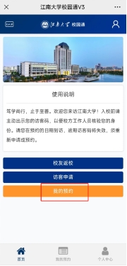 手机关注“e江南”微信公众号,点击屏幕下方“校园服务”中的“访客预约”,进入后点击“我的预约”,点击“查看访客码”即可获得访客码。进入校园时出示访客码。