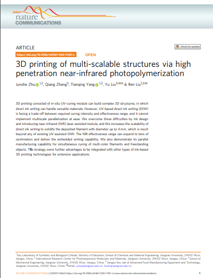刘仁教授团队长期致力于光聚合基础及其在涂料、微电子和3D打印领域的应用技术研究;机械工程学院刘禹教授团队主要开展3D打印工艺与机电装备技术研究。双方团队联合攻关,基于近红外激发上转换粒子原位发射紫外-可见光的策略,设计了全新的3D打印材料,并在自主设计的工艺装备上,率先建立近红外辅助3D墨水直写技术,实现了多色彩材料、跨尺度(3个量级制造分辨率)、无支撑的3D打印,打破了传统三维成形方法的材料局限性与制造精度局限性,有望加速3D打印技术在柔性传感、软体机器人与生物医疗领域的应用。